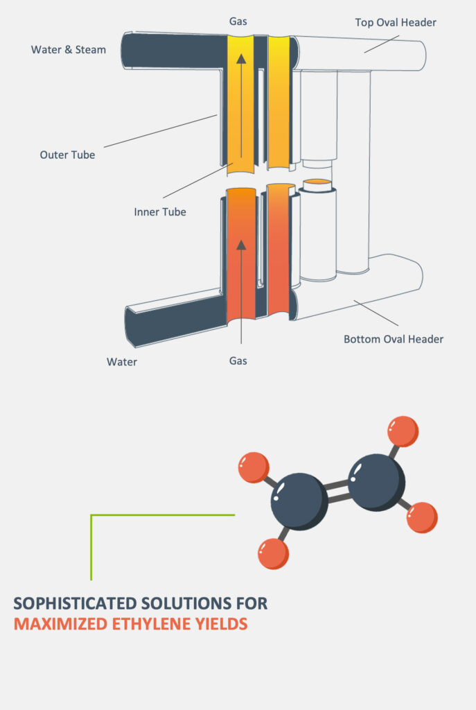 Basierend auf unserer bewährten Doppelrohr- & Ovalsammler Technologieplattform bieten unsere TLEs unübertroffene Zuverlässigkeit und eine lange Lebensdauer. Durch die schnelle Abkühlung des Spaltgases von 900 °C auf 350 °C in Millisekunden verhindern sie Sekundärreaktionen, optimieren die Ethylenausbeute und erzeugen Hochdruckdampf für eine verbesserte Energieeffizienz.